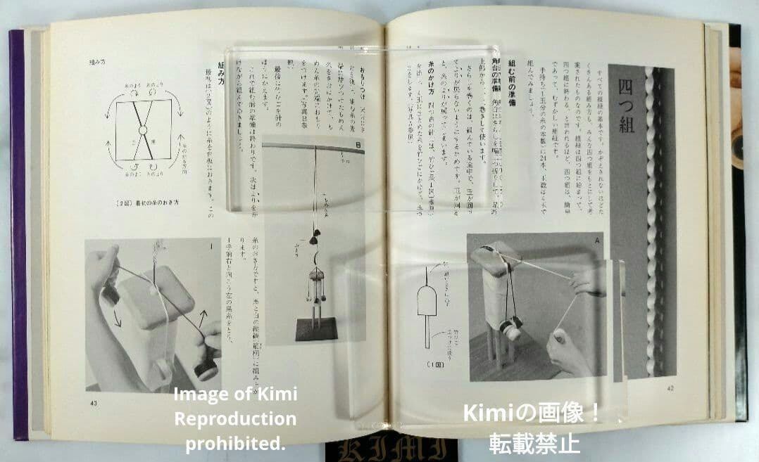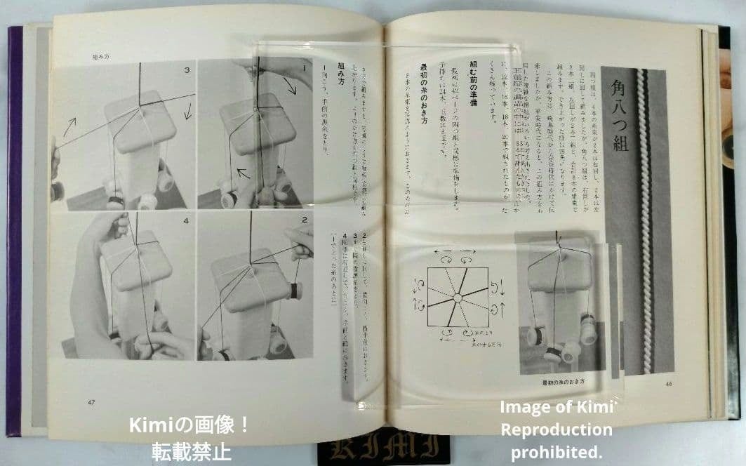 四つ打ち台と丸台を用いて紐を組んでいく技法について書かれています。