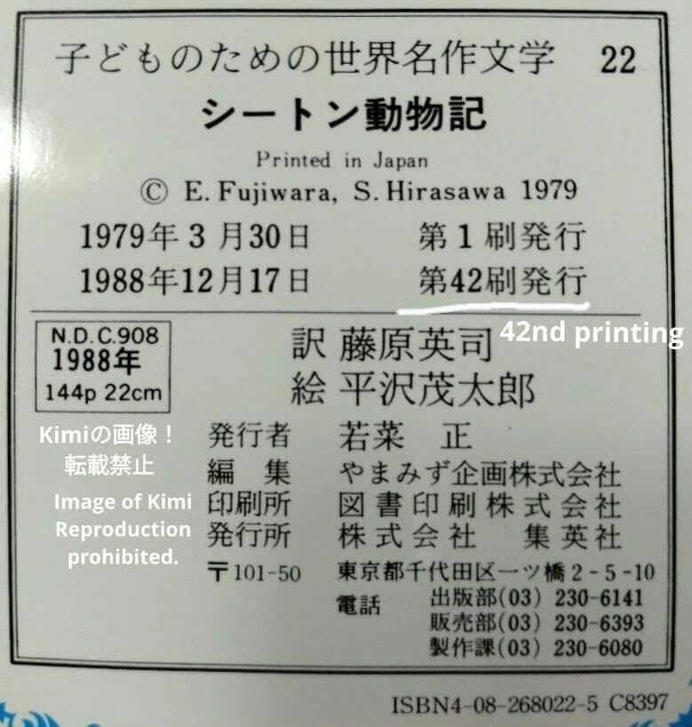 シートン動物記 子どものための世界名作文学 22 本 42刷 1988/12/17 シートン (著), 平沢 茂太郎 (イラスト), 藤原 英司 (翻訳) Seton Animal Stories Children's World Classics Vol.22 Book 42nd Printing 1988 Ernest T. Seton Illustrated
